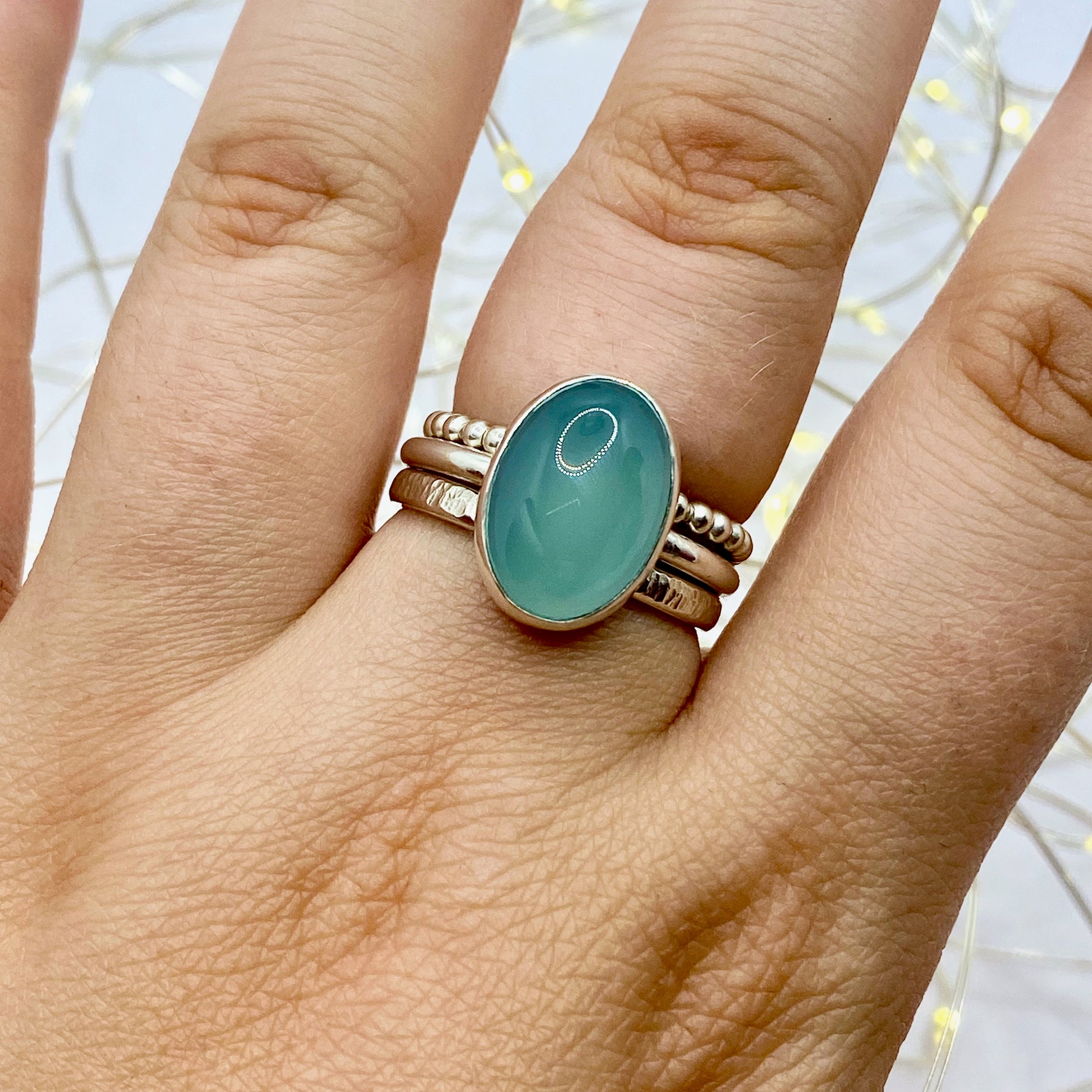 The pale turquoise of these beautiful chalcedony stones almost seems to glow from within. Pair with your choice of stacking rings to create your perfect ring stack!