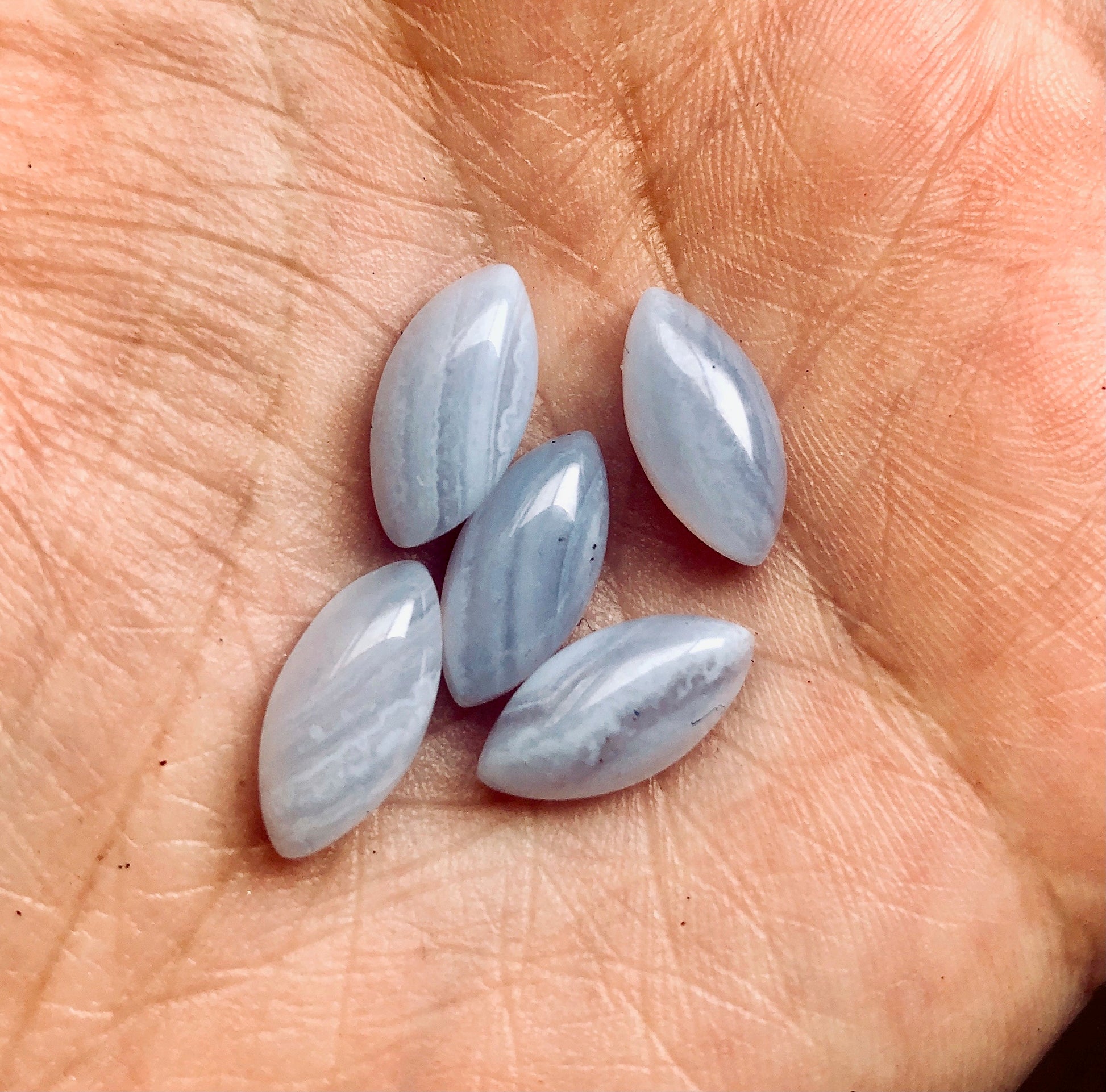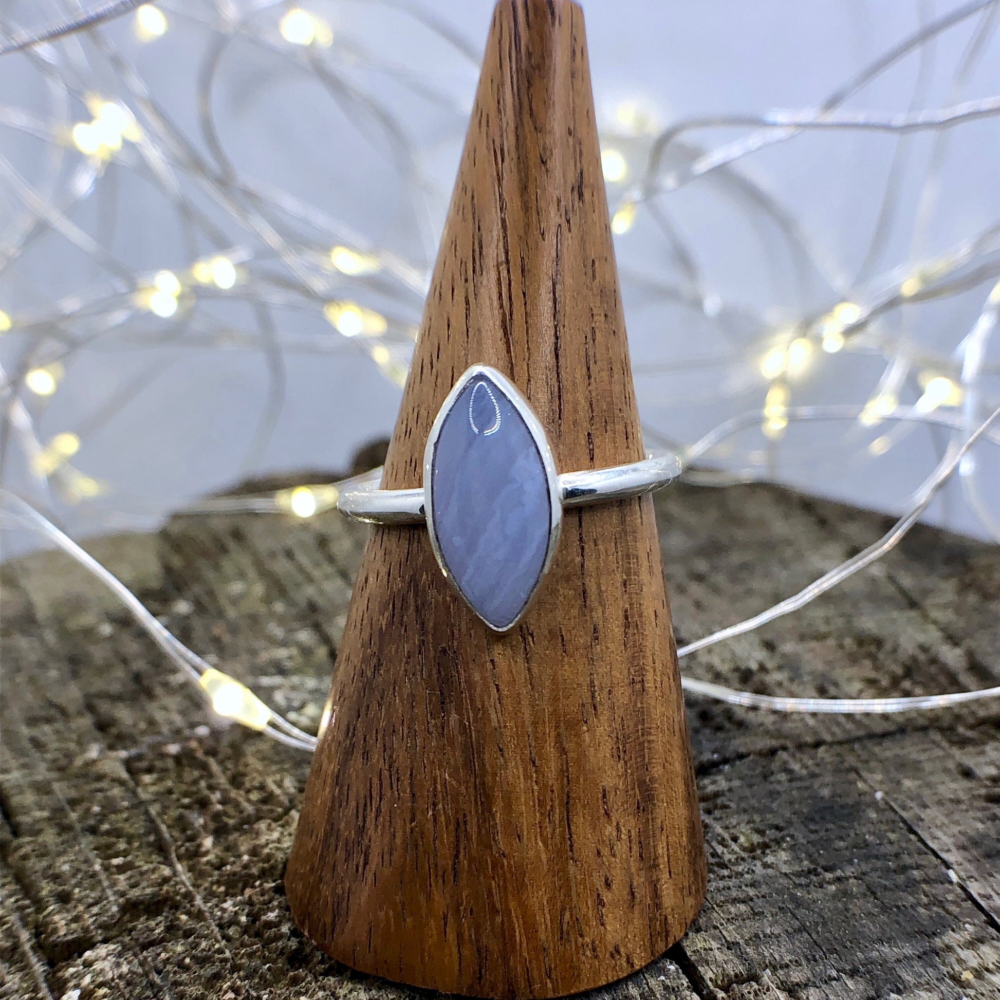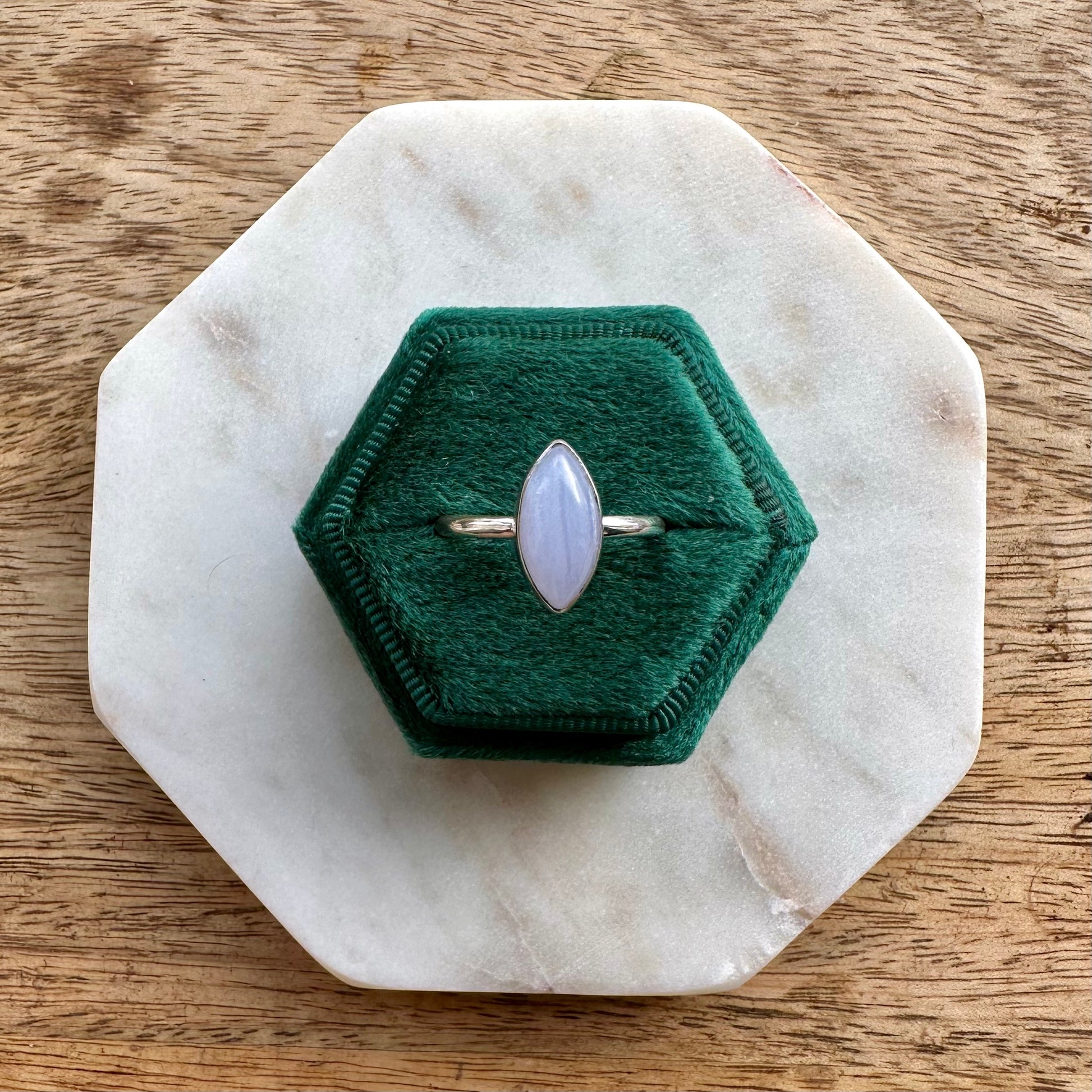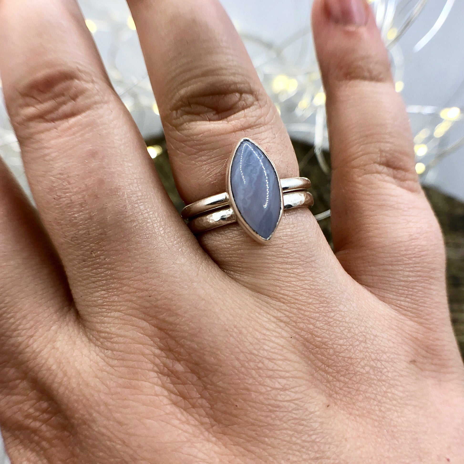 Indulge in unique elegance with this Blue Lace Agate ring. The delicate marquise shape perfectly showcases the powder blue hues of the agate stone, making this ring a must-have for any jewellery collection. Elevate your style with this stunning and versatile piece. Pair with your choice of stacking rings to create your perfect ring stack!
