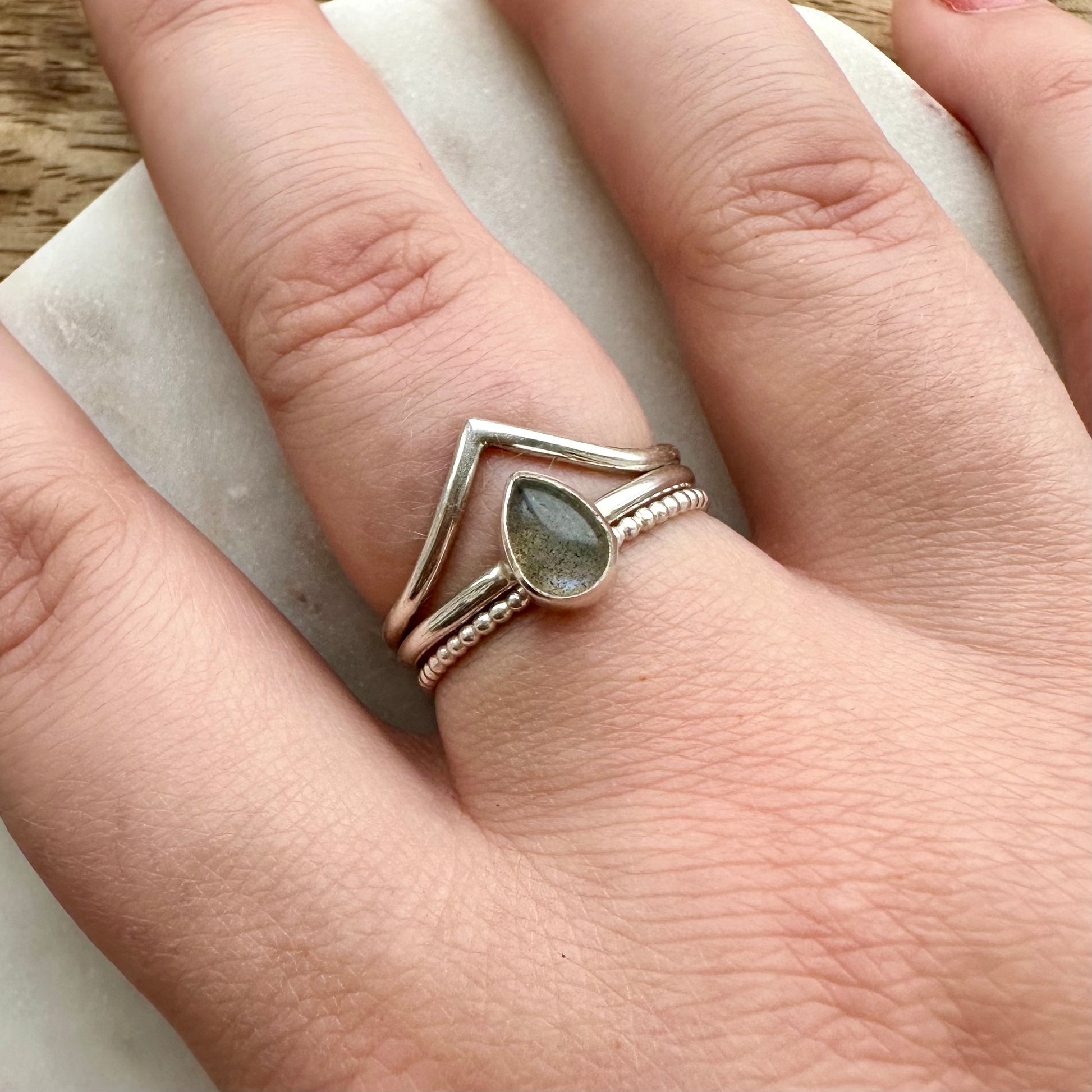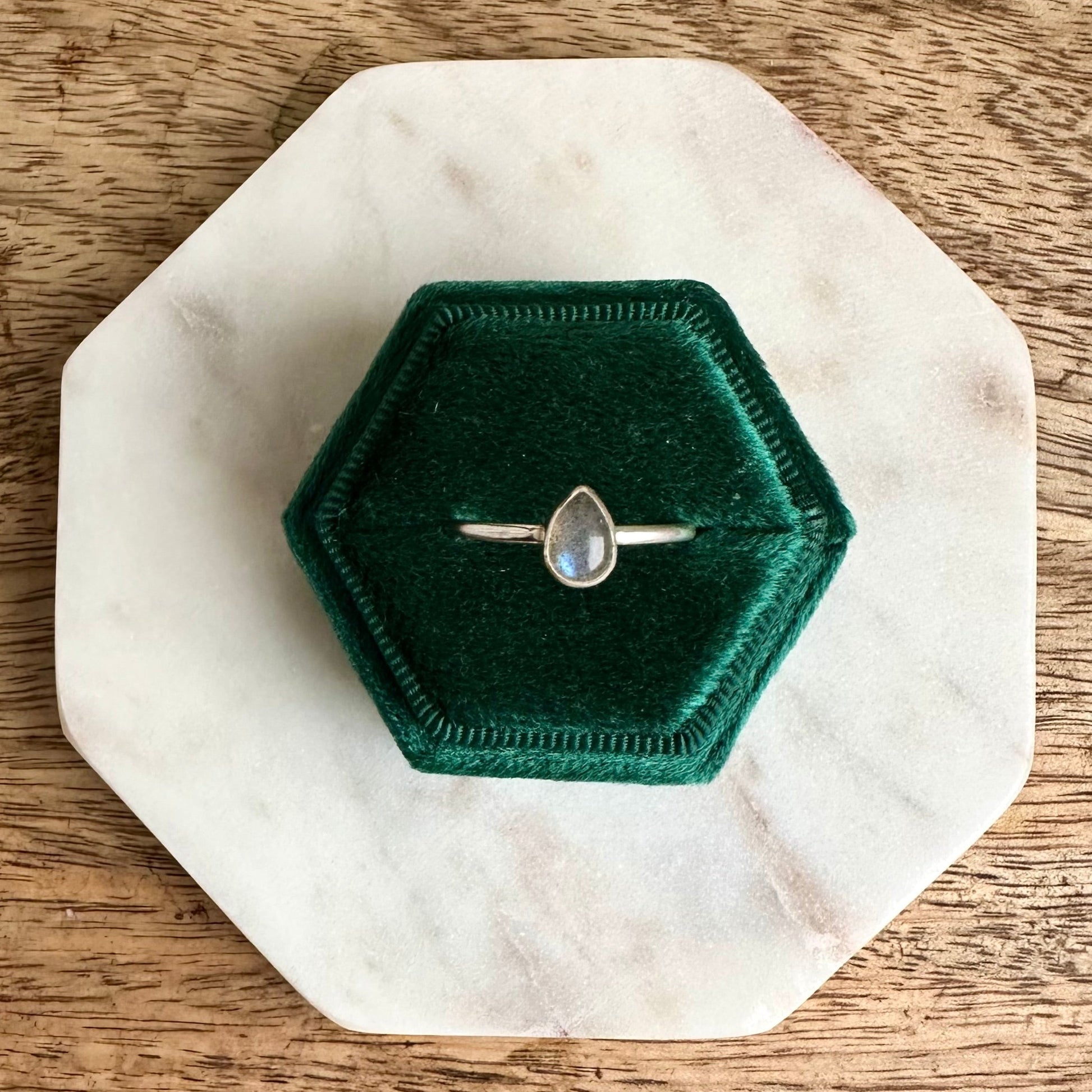 This dainty labradorite ring boasts an ethereal glow with its magical colour flash. Adorn your fingers with this playful and ethereal piece. Pair with your choice of stacking rings to create your perfect ring stack!