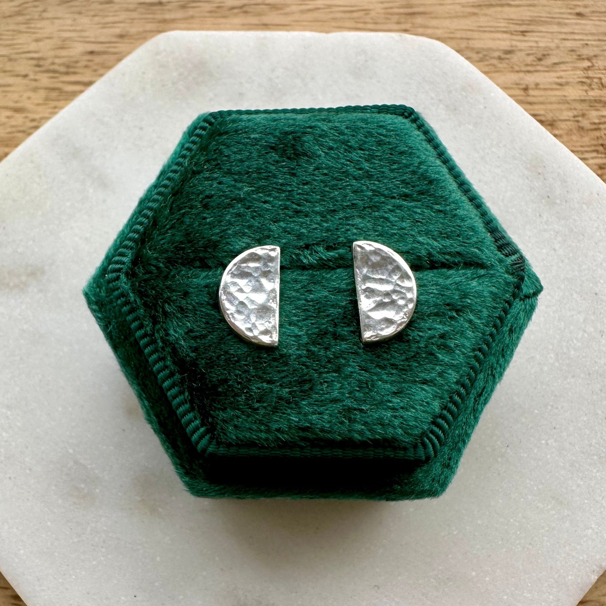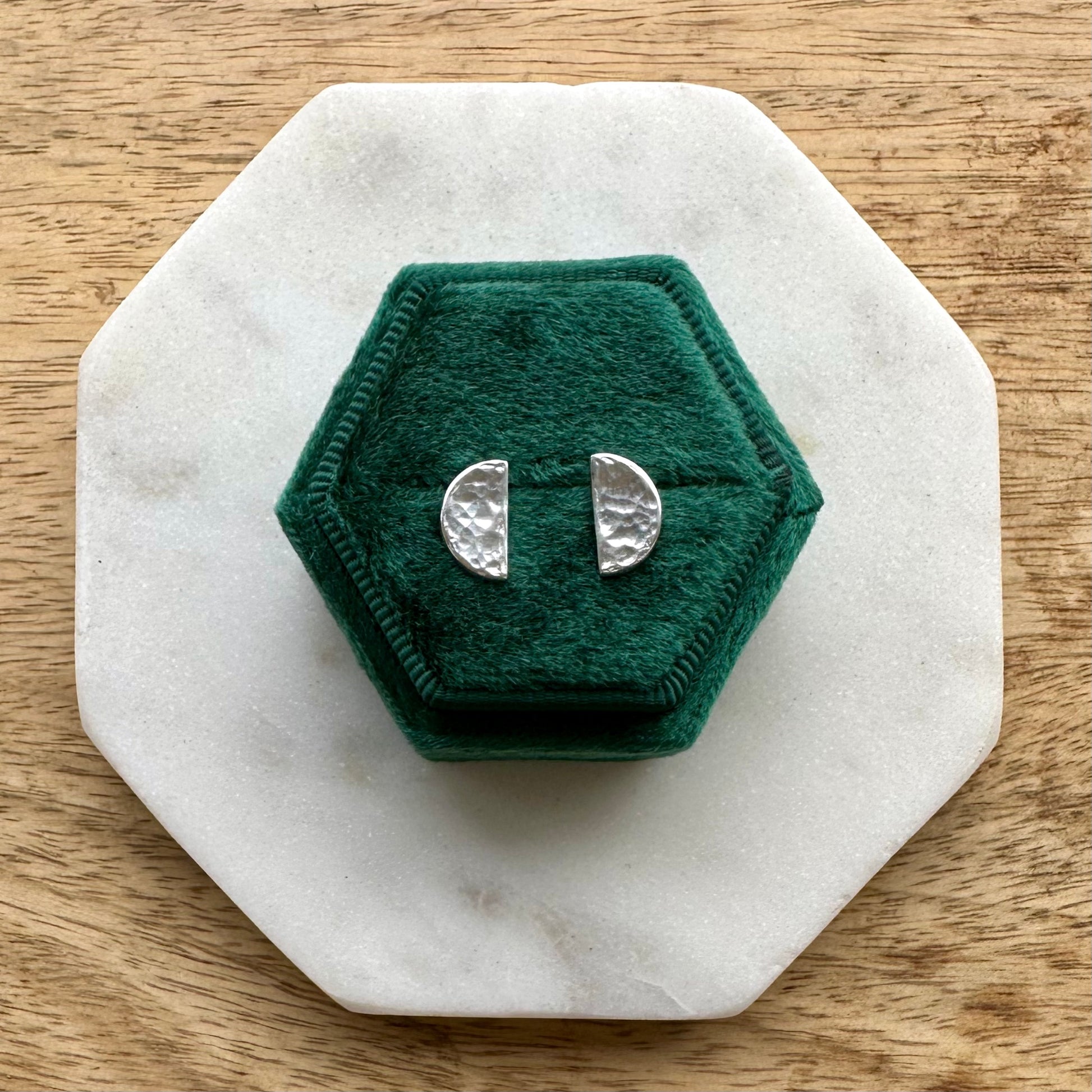 These earrings are made from solid sterling silver formed into the shape of a half moon, with a textured/hammered finish that catches the light beautifully.