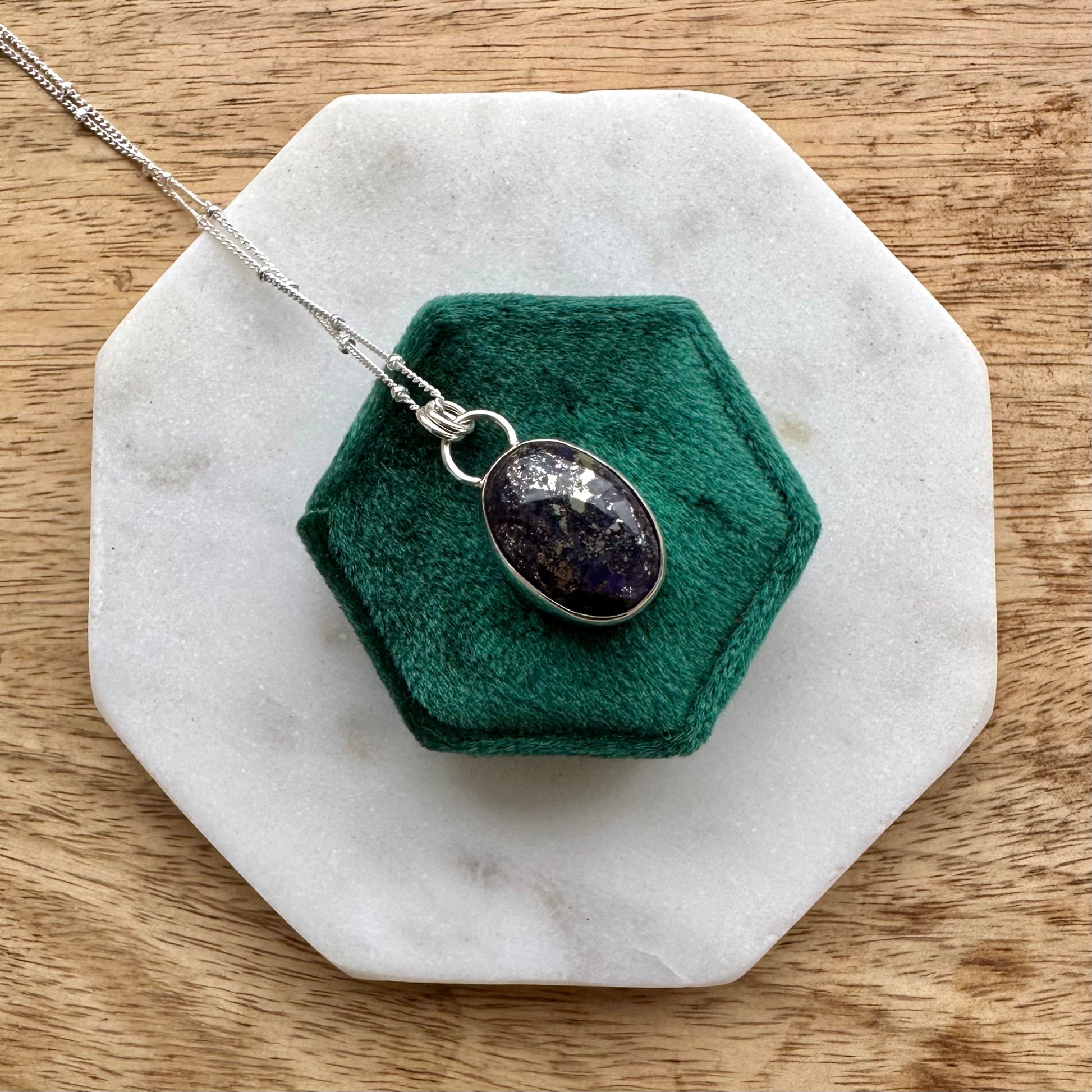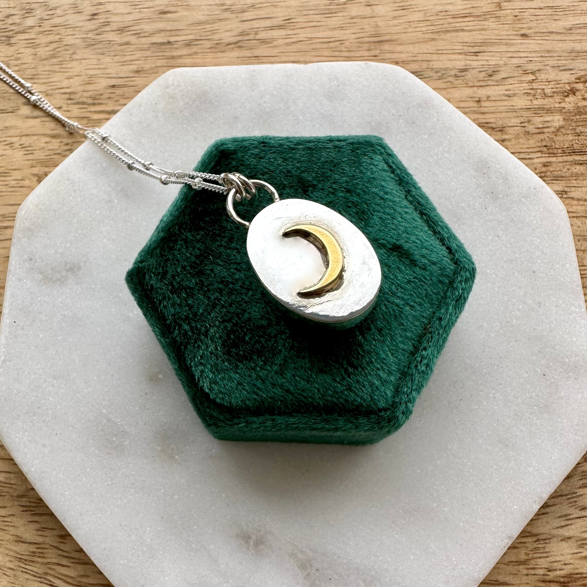 Explore the beauty of the night sky with our Lapis Lazuli Moon Necklace. This celestial piece is enhanced by a golden moon accent, perfect for any witchy look. No need to wait for a full moon to embrace your inner magic – wear this necklace anytime!