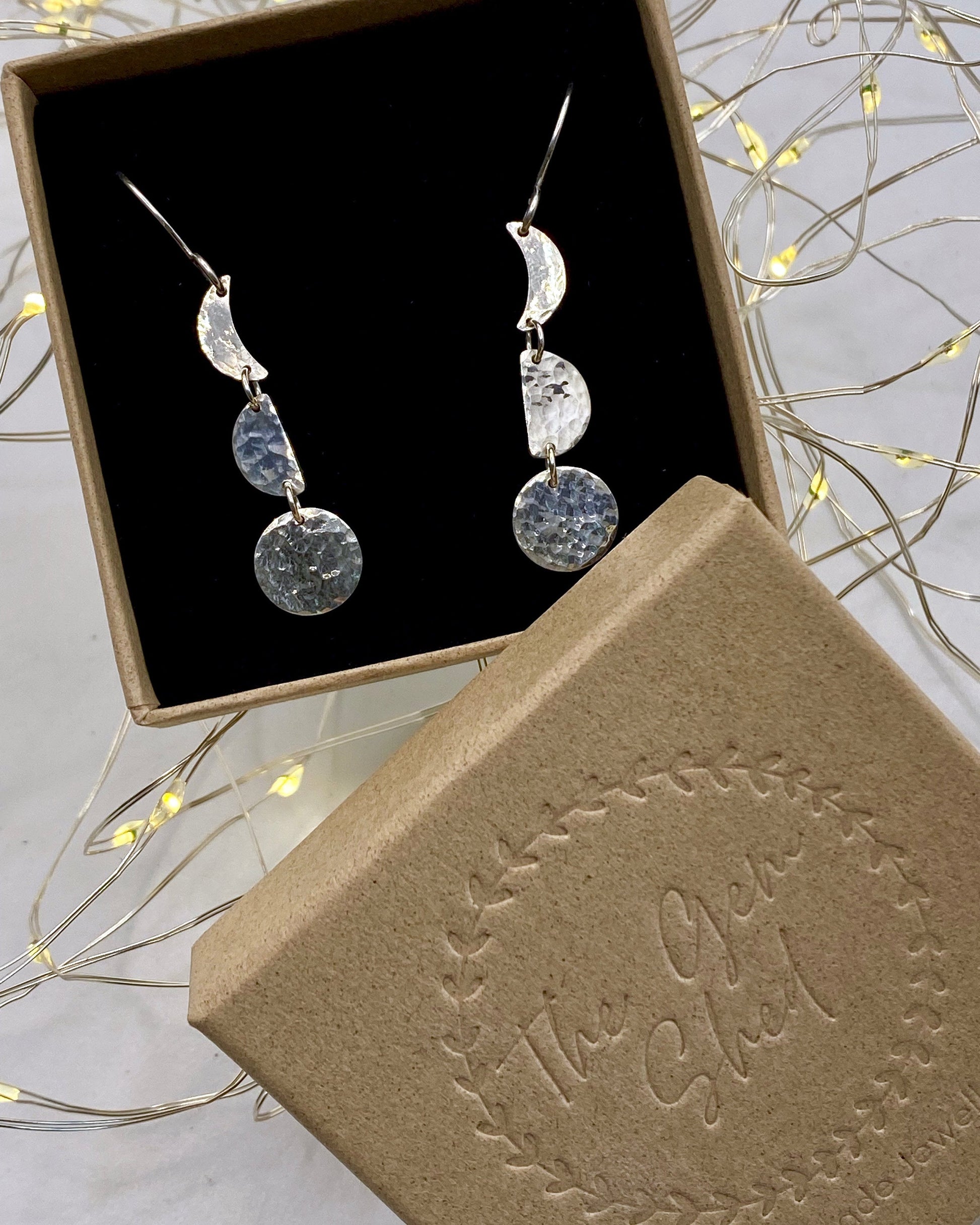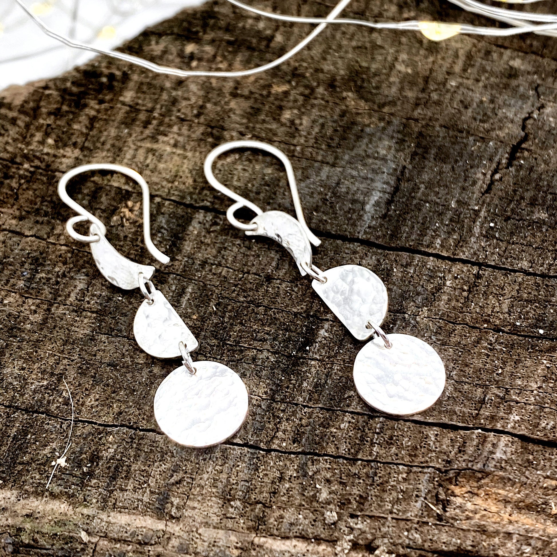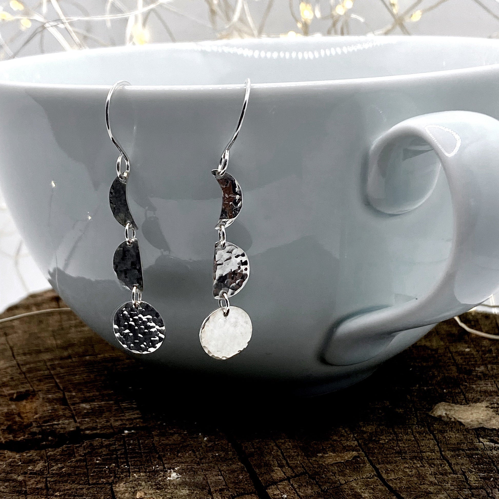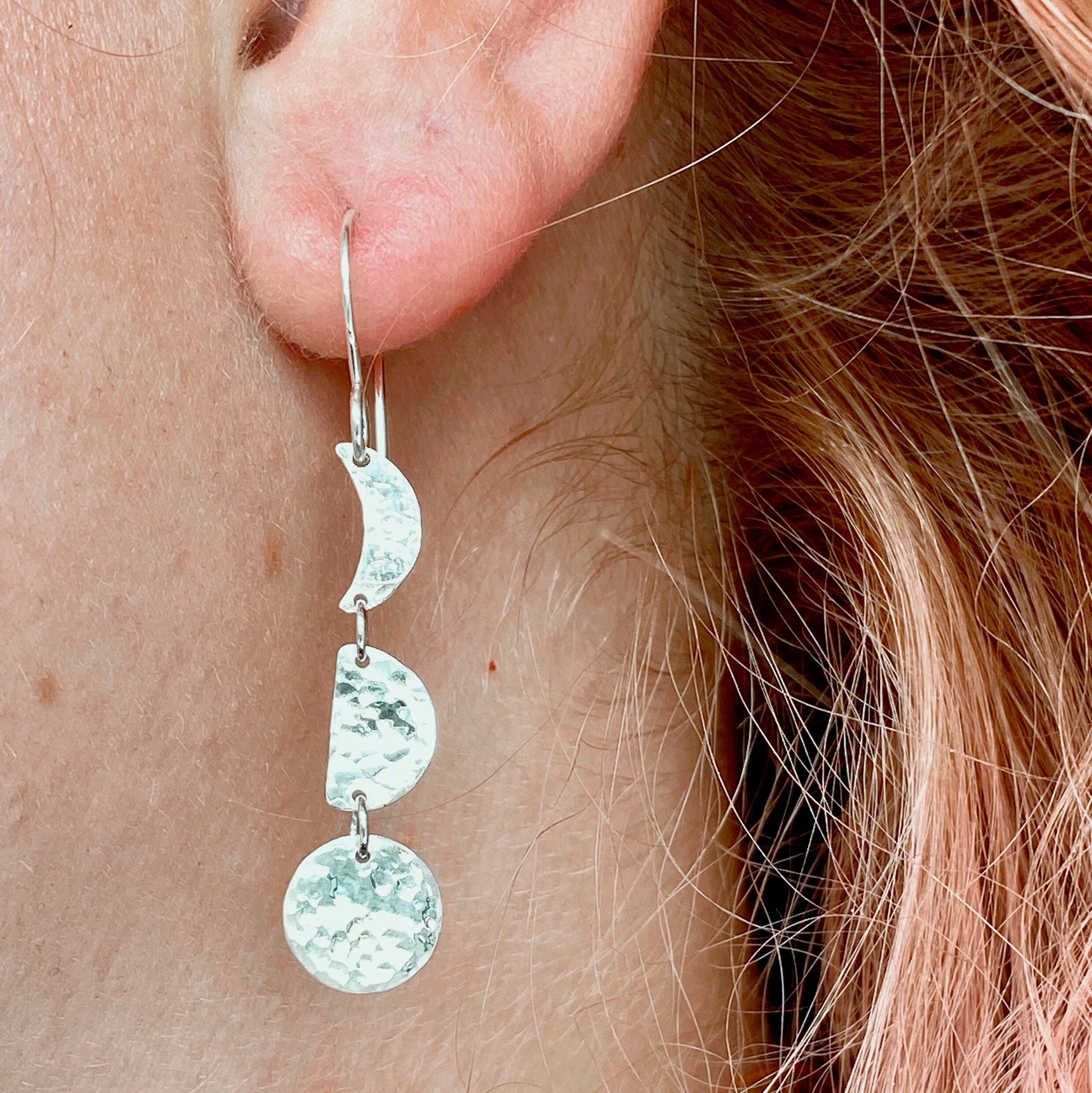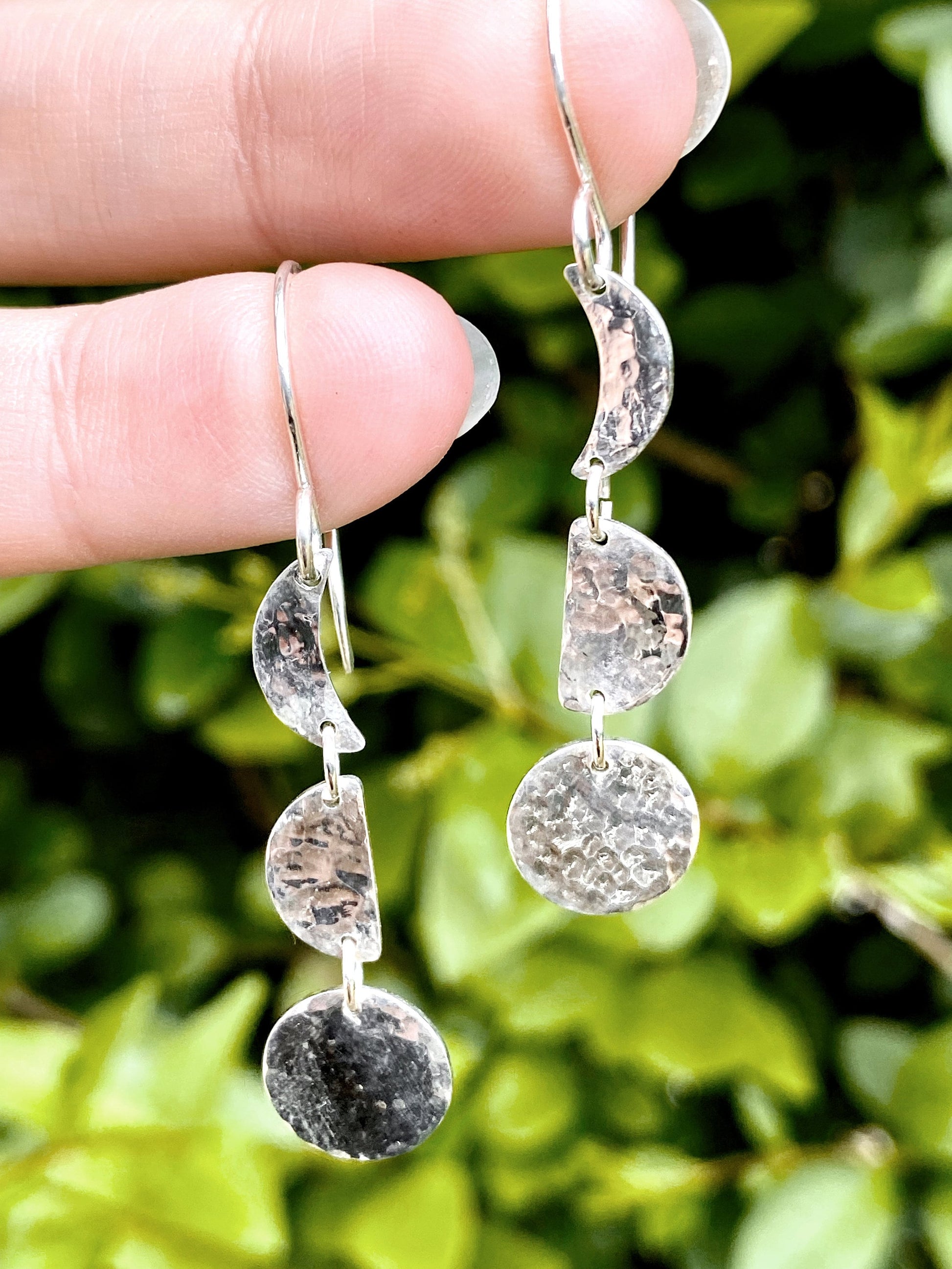 These earrings are made from solid sterling silver formed into the shape of 3 different moon phases, with a textured/hammered finish that catches the light beautifully.