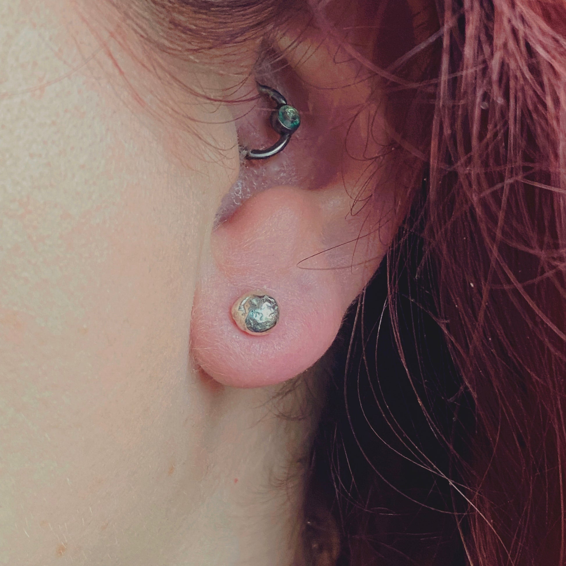 These earrings are approximately 5mm across, however due to the nature of the making process, sizes may vary slightly. They weigh around 1 gram each so are nice and lightweight for everyday wear, and feature a sterling silver post with butterfly push-back.
