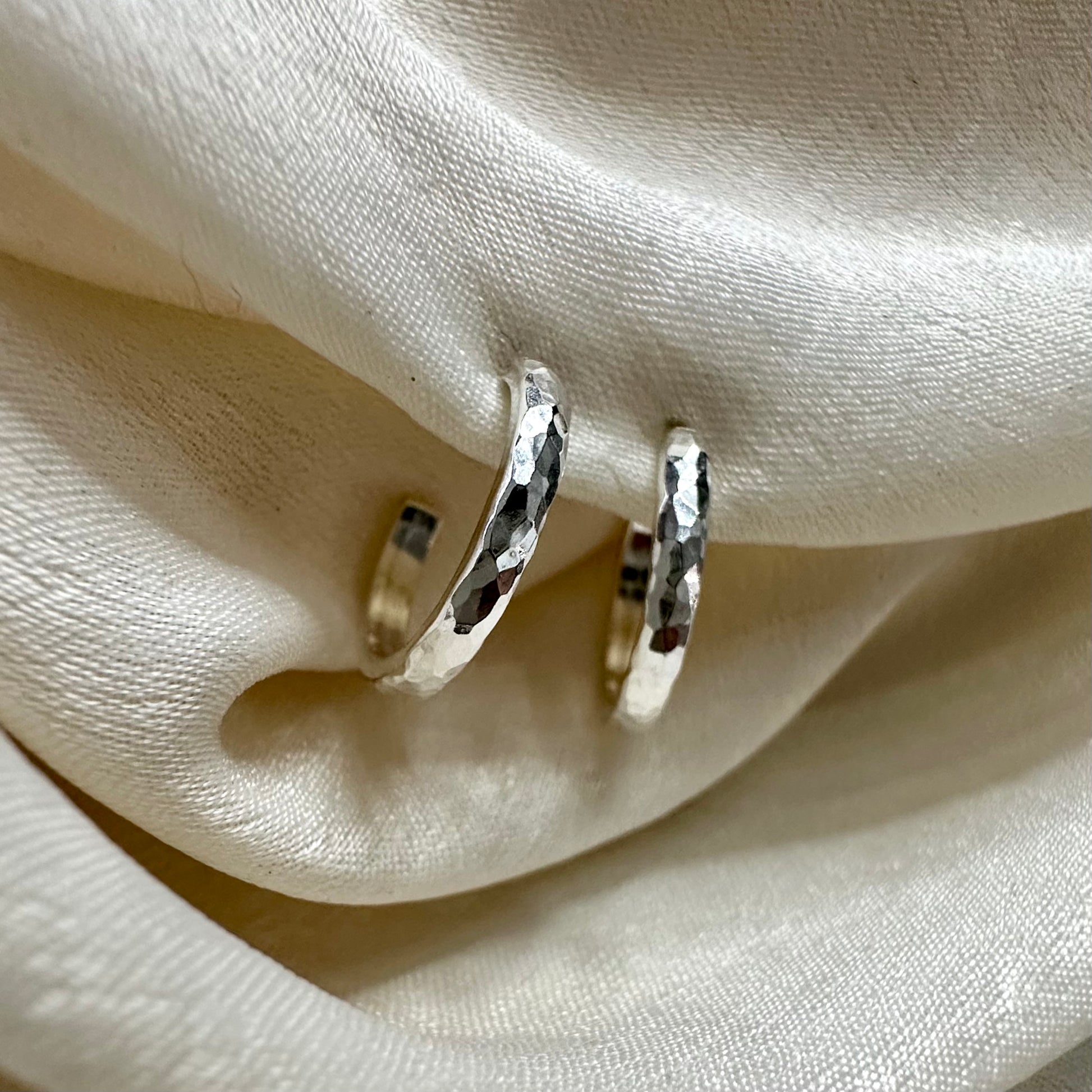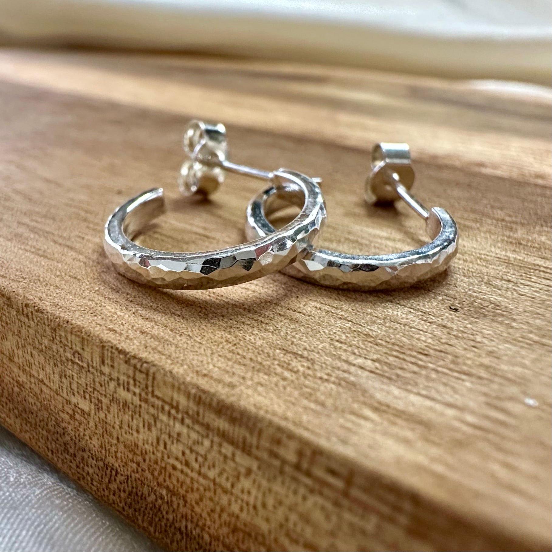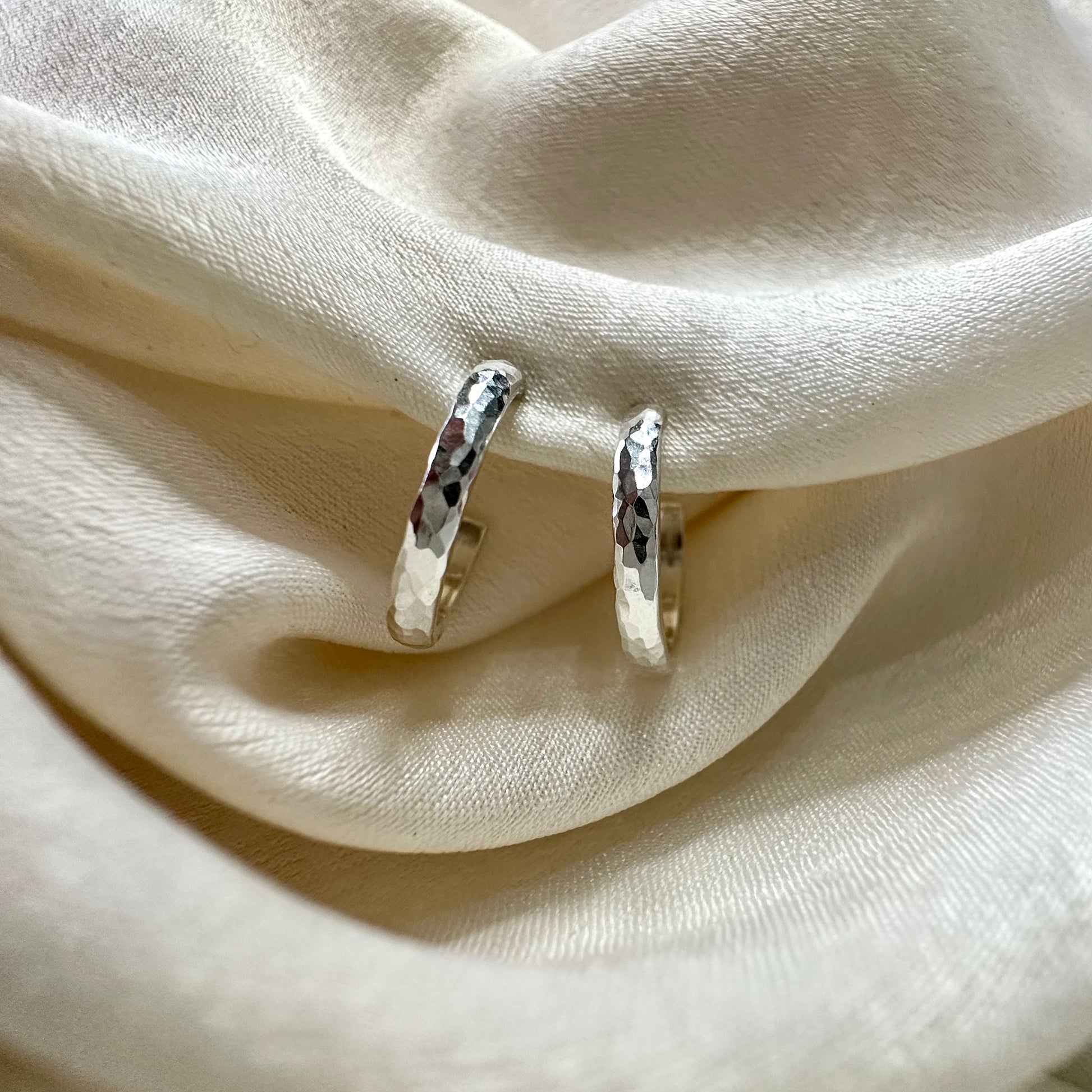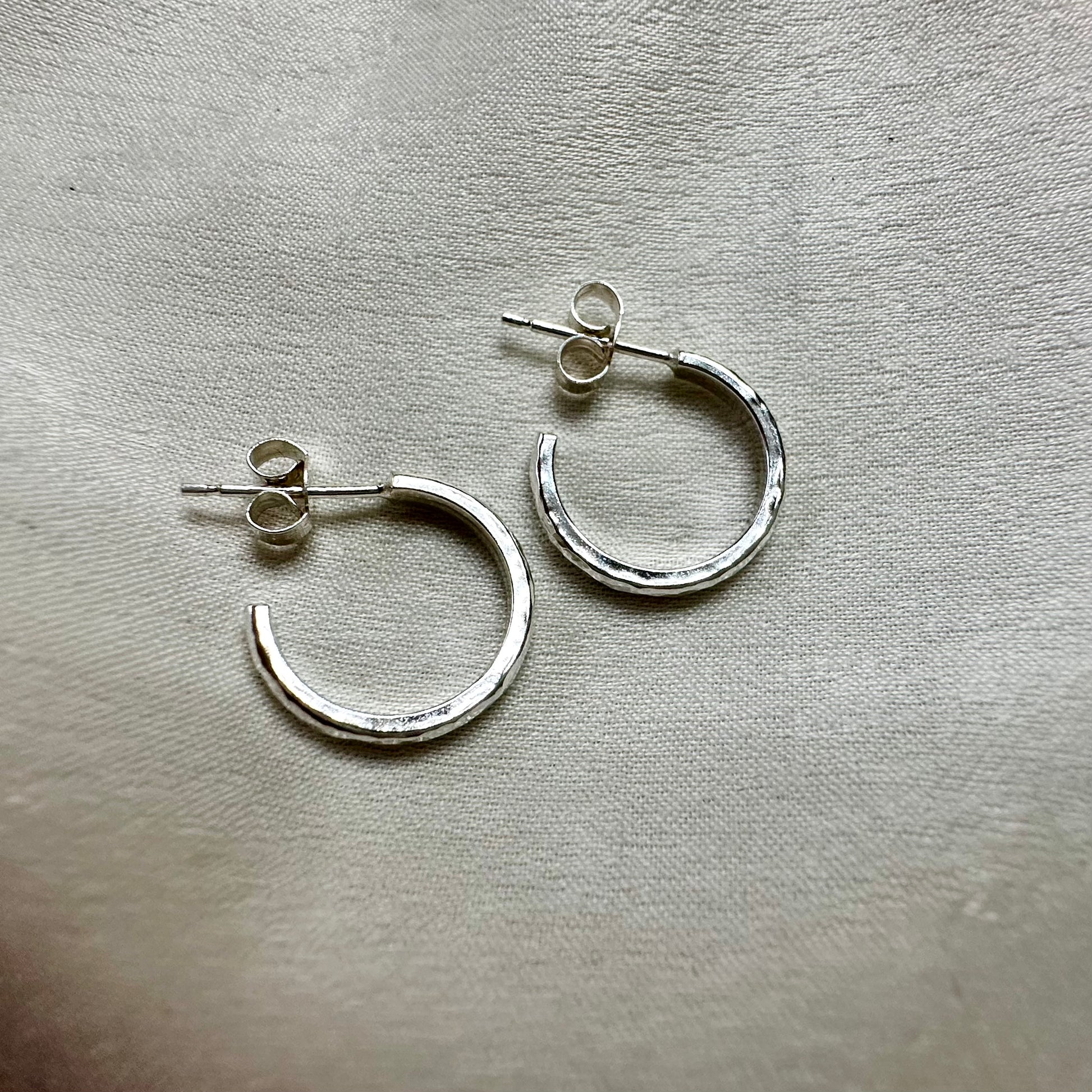 Tiny huggie hoop earrings in a hammered finish, featuring earring posts with butterfly push-back.